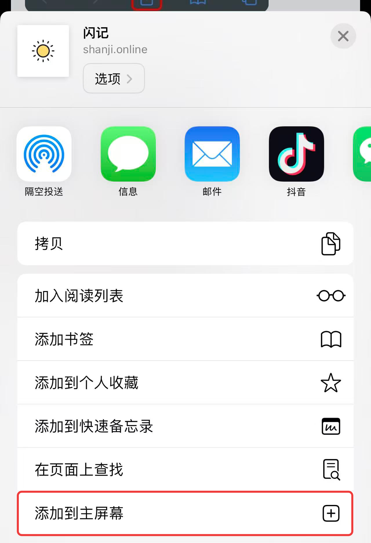 往下划,点击“添加到主屏幕”。