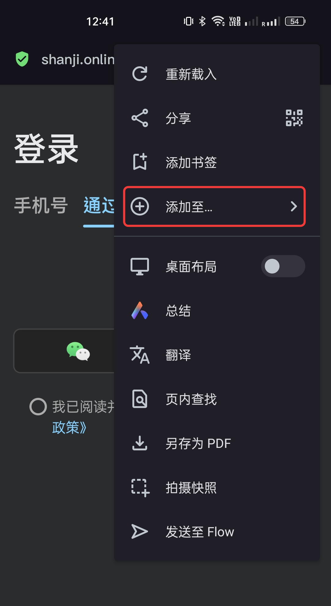 点击右上方工具栏上的更多“...”按钮,弹出菜单;在菜单上选择 添加至...。
