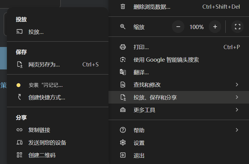 ...更多按钮,选择投放、保存和分享,点击安装“FlashNote”...