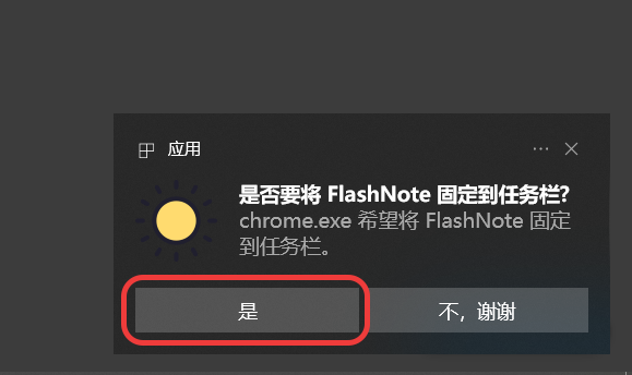 紧接着,Windows 可能会弹窗提示 是否将FlashNote固定到任务栏?,点击 是。