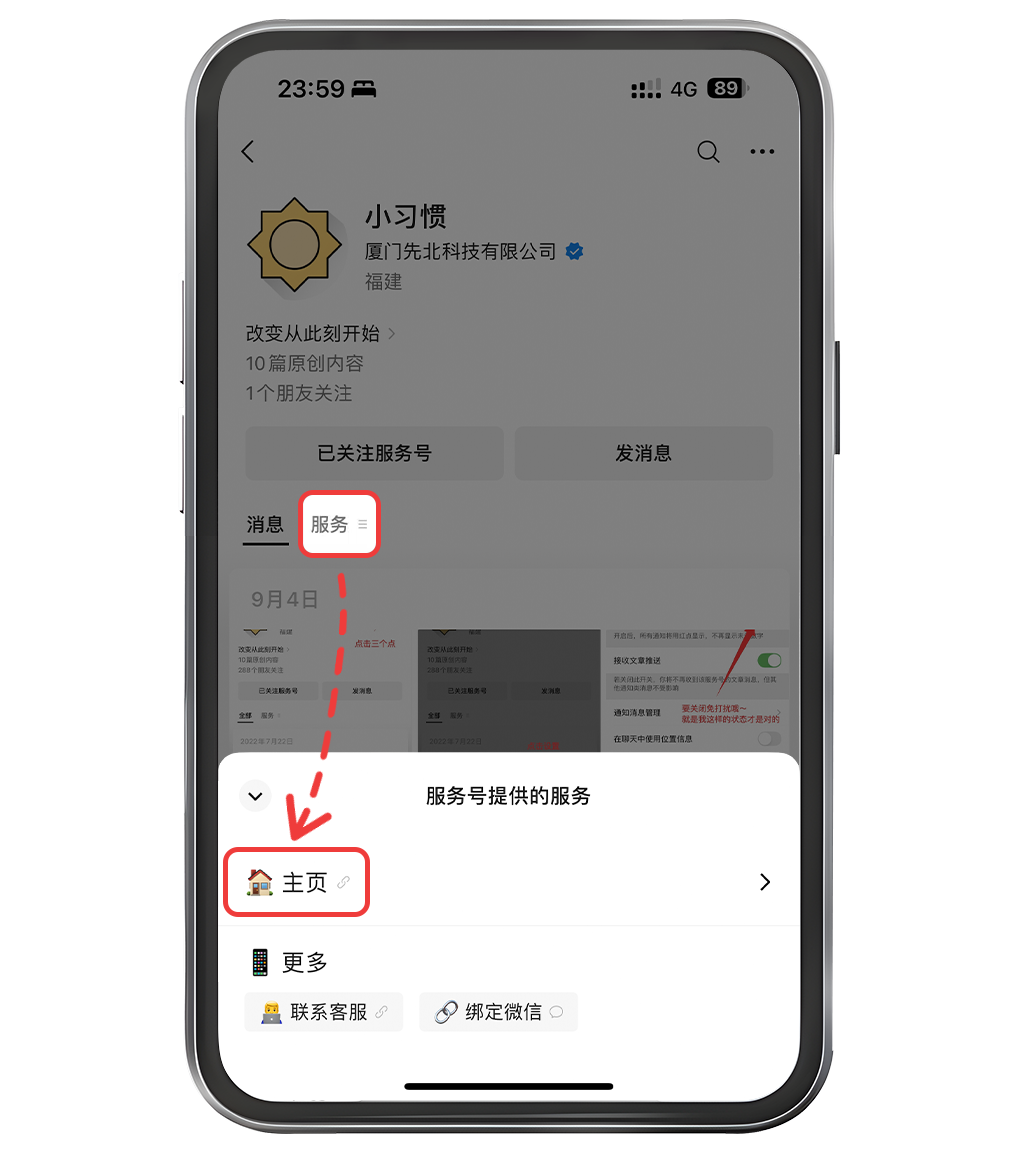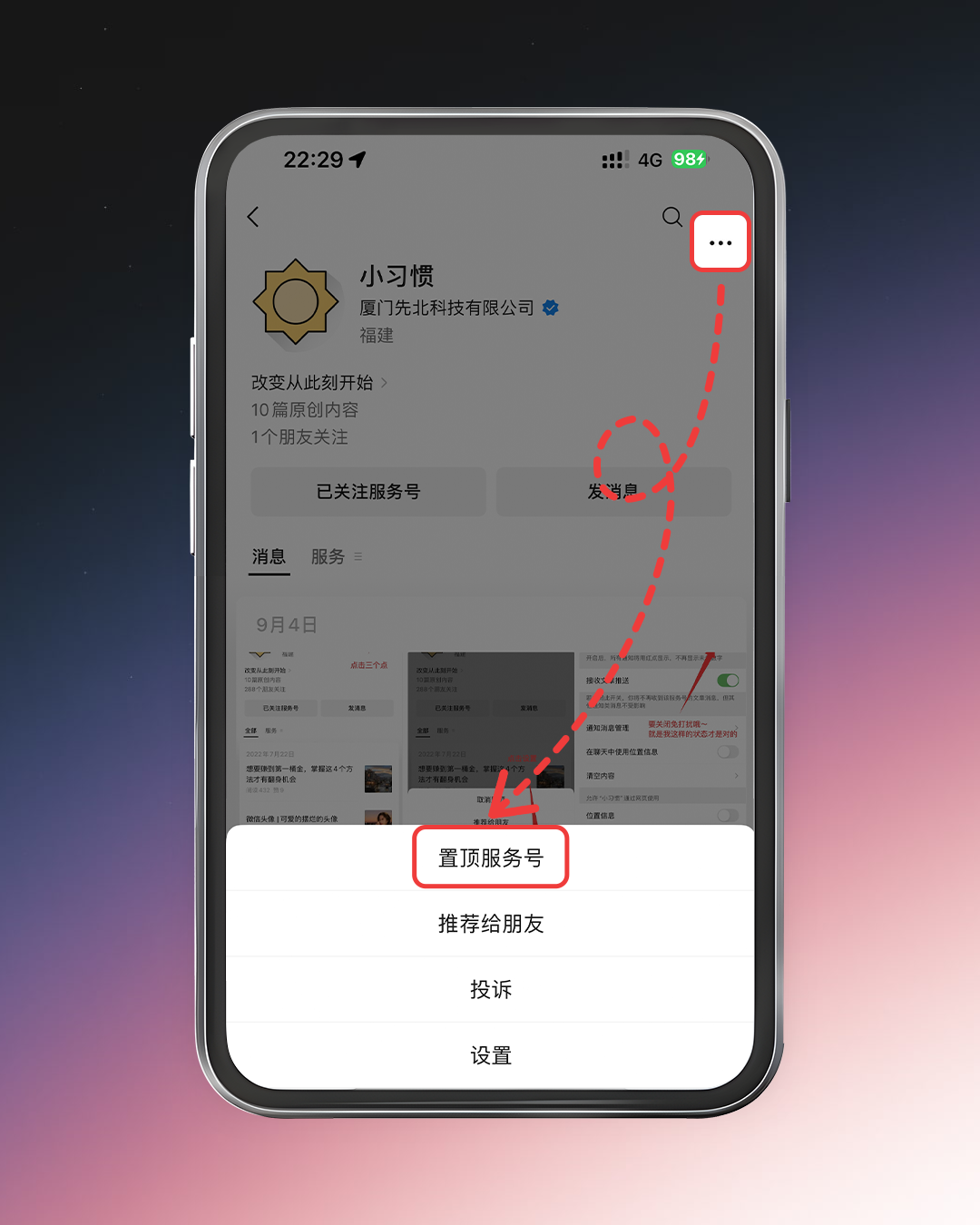 扫描上方二维码关注服务号,点击右上角的 ... → 置顶服务号: